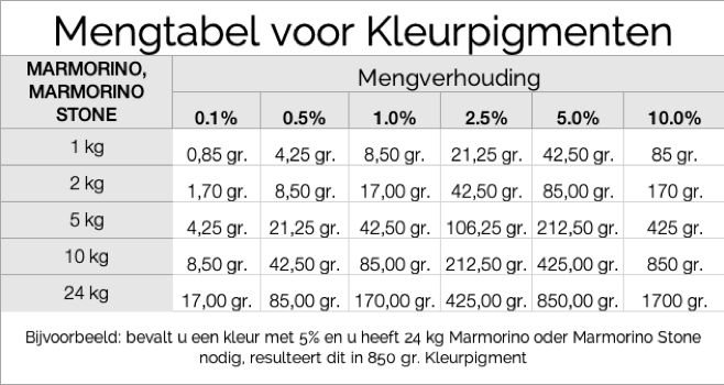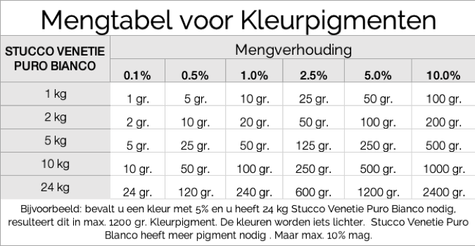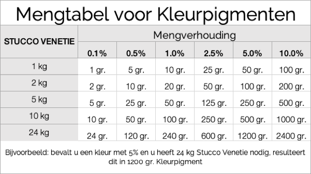 Ongeveer 800 ml vloeistof wordt gebruikt voor 1000 g pigmenten (800ml water of 160 ml bevochtigingsmiddel en 640 ml water). Plaats de vloeistoffen in een emmer of iets dergelijks en strooi de pigmenten erin, goed roeren en wrijven; plet klontjes op de rand van de emmer. Je gebruikt een lepel, een spatel of iets anders. Het is het beste om je mengrecept op te schrijven, zodat je weer dezelfde tint kunt produceren. Laat dit kleurendeeg minstens 3 uur weken. Het kleurendeeg kan echter ook zonder problemen overnacht blijven staan. De emmer moet gedurende deze tijd worden afgedekt. Meng vervolgens het kleurdeeg in de spachtelmassa (goed mengen). Het beste mengresultaat wordt bereikt als de inhoud wordt geleegd in een afzonderlijke emmer en opnieuw goed wordt gemengd met een mengstaf. De pasta is dan meteen klaar voor gebruik. Pigmenten hebben de hoogste kleurintensiteit en stellen geen grenzen aan uw creativiteit. Gebruik echter alleen kalk-compatibele pigmenten.